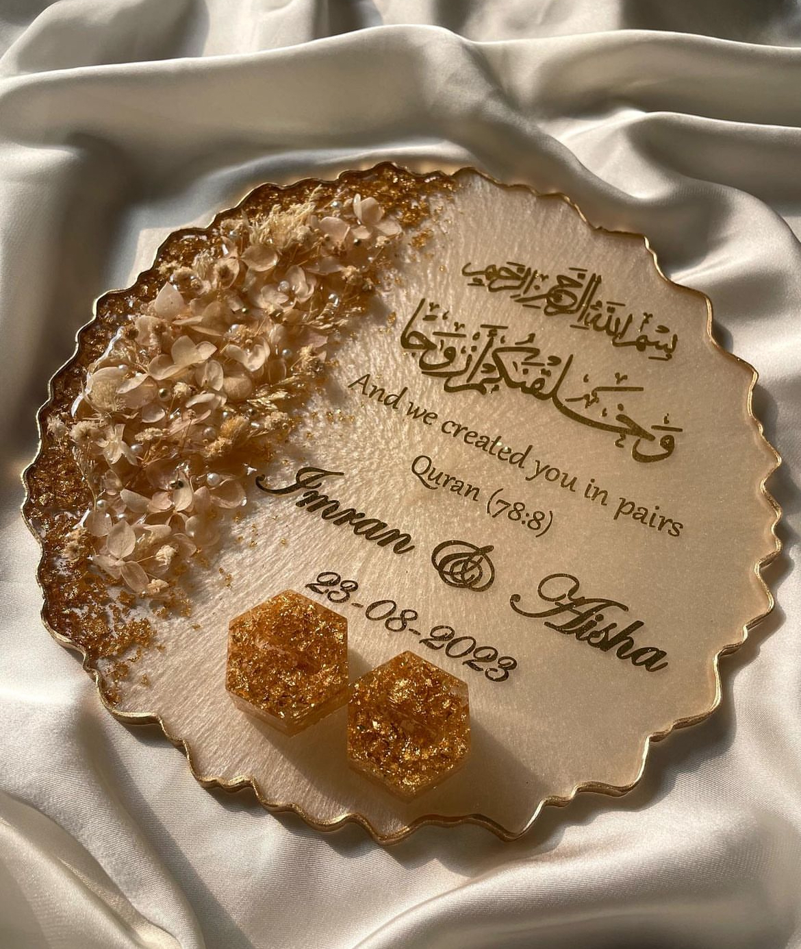 “Present your engagement rings in style with our handmade engagement ring platter, adorned with real flowers. Each platter is a unique creation, capturing the natural beauty and elegance of fresh blooms to add a touch of romance to your special moment.”