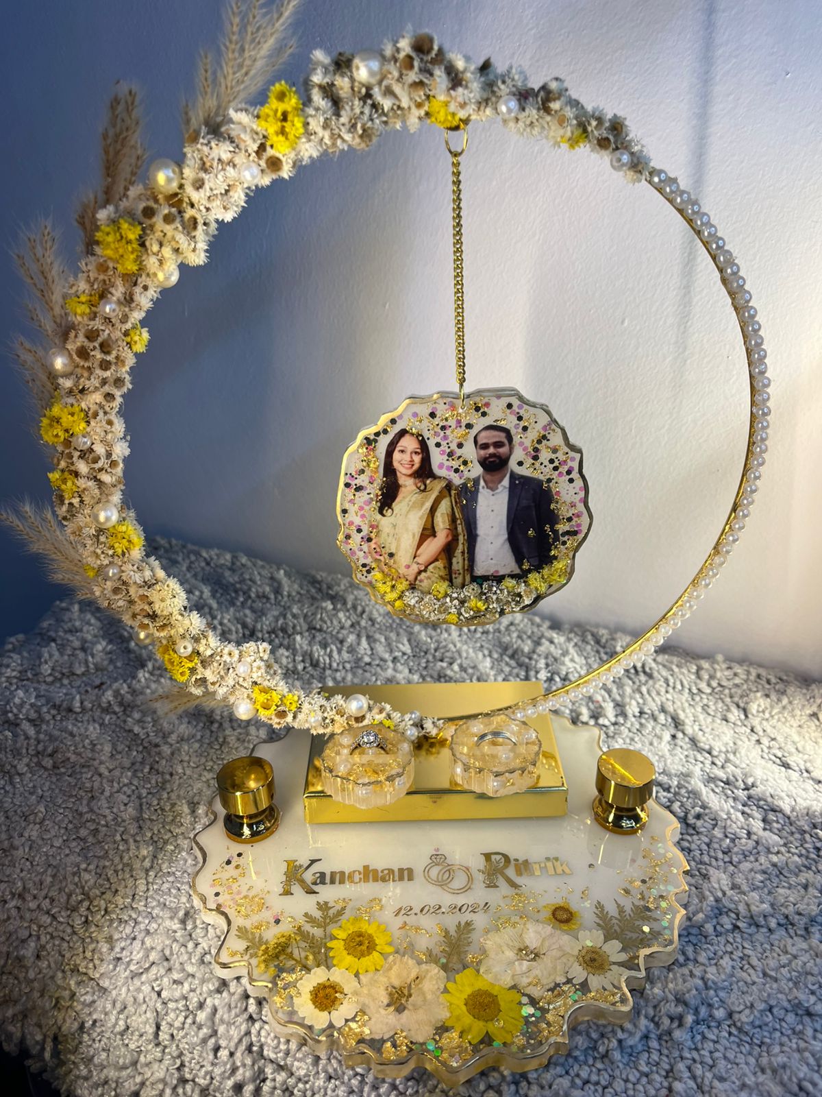 “Celebrate your love with our handmade engagement ring platter, beautifully adorned with real flowers and complemented by a hanging photo coaster. Each piece is uniquely crafted to capture the essence of your special moment, blending natural elegance with a personal touch.”