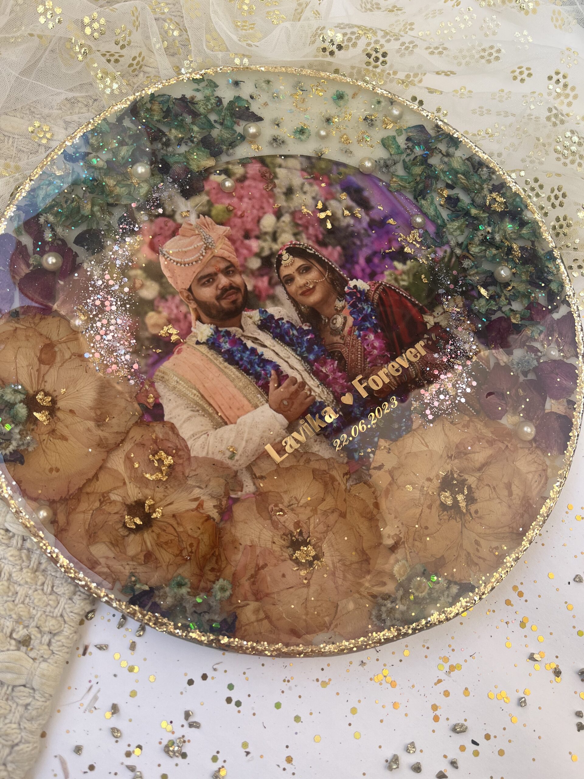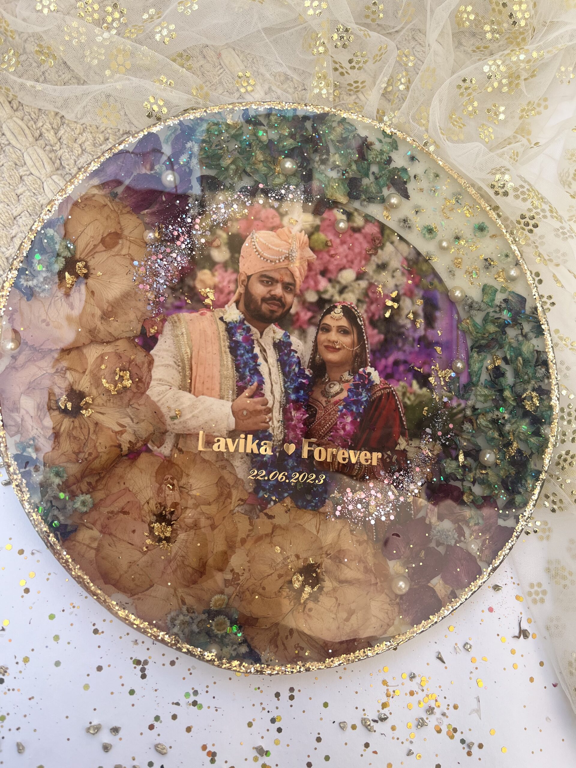 Handmade Varmala frames are exquisite keepsakes that preserve both flowers and memories for life. Featuring intricate Varmala motifs symbolizing eternal love and unity, these frames are crafted with the highest quality materials to ensure durability. Perfect for safeguarding cherished moments and the flowers that accompany them, these frames are designed to last forever, keeping your precious memories beautifully displayed for generations.